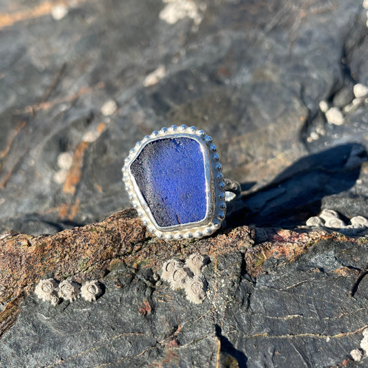 Adjustable Beaded Cove Sea Glass Ring - Cobalt Blue